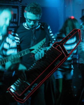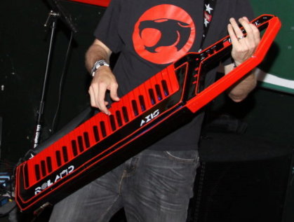 Now, any project like this is bound to be quirky, and once the keytar arrived home from its extended visit to various UK workbenches, my good pal, synth tech, and Parallax producer Randel and I had to spend a few hours messing around inside the thing tying up a few minor electrical loose ends (not the least of which was a fair bit of protective sealing, since the keytar's factory silver paint job turned the whole thing into one big, fat conductor!), and adding in a power inverter for 15 feet of electro-luminescent wire (i.e. "el-wire"). This install was all on me, and since I'm neither ingenious nor crafty, I used packing tape for it. Looks great in pictures, but much less so up close. The changeover to battery power allowed for the use of standard 5-prong MIDI cables. This in turn allowed me to purchase a "MIDIJet" wireless MIDI transmitter (no longer available, although you might be able to find a used one somewhere). This thing transmits up to 500 feet away, meaning I could theoretically play entire gigs from my car. |