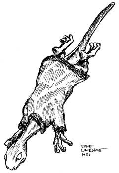 The Agaraugn (AG-uh-ron) can physically adapt to all but the harshest of climes, but prefer living high above, among the limbs of giant trees. On occasion, one or two wandering Agaraugn might travel to other villages to explore in the shodows. They are excellent thieves and love stealing books, escpecially of the magical sort. Their intelligence and knowledge base give the average Agaraugn spell-using capabilities of Illusionists (up to 3rd level). All traveling Agaraugn wear magic robes reducing their armor class from a natural 8 to as low as 4. These robes are only effective on members of their race, and can even have adverse effects on human armor class (increasing it from 0-3 points) if worn. A robe can be removed from the creature upon any successful "to hit" roll. They can bite if necessary, but prefer either weapons suitable for magic users or illusionists, and of course spell use above all other means. Each Agaraugn village is very well hidden among the treetops, and contains a treasury (type I) and library. The library will contain a diary (written in Common) of the village history, and will stop at nothing to retrieve it if stolen. |