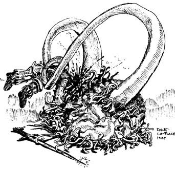 Dissolver within an are of 100 feet, but that detection will alert the beast as well. In the absense of psionic battle, the Brain Dissolver will proceed to lash out with each of two tentacles at the characters most affected by the BLAST (but still alive), attacking at +2 to hit. A score of 18 or higher shatters the hit character's skull (4-40 damage), exposing the brain (blood loss 1-8 points per round). Each round thereafter, it will attempt to drag the body close enough to absorb the victim's organ free (instant death), attacking at +4 to hit. While attempting to feed, it will not lash out at anyone else. Opponents hit by a tentacle but not constricted are "merely" whipped for 1-12 damage. It only uses Psionic BLASTS at non-psionics; but will use other attack and defense modes expertly in a mental conflict. |