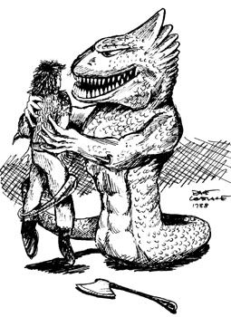 and inflicting double damage every time. All Tomoxi are capable of the following spells as a 12th level MU: DARKNESS 10' RADIUS, FEAR, DETECT INVISIBILITY, TELEKINESE 6000gp WEIGHT, 3-dice FIREBALL (once per three rounds), and GATE (summons a Demon Type I, II, or III, 45% success) once per day. For more about the general characteristics of Demons, see MMI (p.16) and MMII (p.35). |