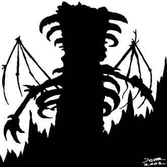 This being resembles a tall, not always humanoid mass with horrible talons, spikes, and barbed appendages, always silhouetted in utter blackness. The touch of a Void Devil carries the same effect as being exposed to the Negative Plane for a full round (see MoP, p.54). All nonmagical weapons touching the devil must save vs. Discintigration or be completely absorbed. Magical weapons save with a bonus equal to their magical property, but will still only inflict half damage. A great many spells have no effect on Void Devils, for they possess forms of immunity even greater than many of their most powerful masters. It is only affected by ELECTRICITY (fully), FIRE (1/2), CONTINUAL LIGHT (3-18 damage), DISCINTIGRATE (1/2), or WISH and ALTER REALITY types of "cheat" spells. It is also impossible to psionically attack a Void Devil, for it has a naturally existing state similar to a constant MIND BLANK defense. These devils can use the following spell-like powers at will: DETECT/DISPEL MAGIC/GOOD, HOLD MONSTER, FEAR, HYPNOTIZE, SLEEP, CHARM, GATE 1-4 Pit Fiends (50% success), CLOUDKILL, and TELEKINESE 5000gp WEIGHT. |