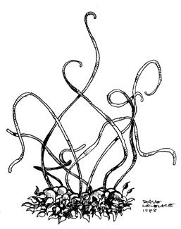 sort of CURE spell is cast (per wound). Vines attack as 1HD monsters at -4 to hit their prey, but once one hits, the "to hit" adjustment increases by 2 for each subsequent attack by both it and any neighboring Dinuams. In the case of two 5-vine plants attacking (all vines in the same round, mind you!), once the first vine hits at -4, each subsequent one attacks at -2, 0, +2, +4, +6, etc. Here's where it gets interesting: these vines each HOLD FAST until either severed normally, or if its prey breaks free on his own by successfully rolling his BEND BARS percentage. Now, if 5 or more vines are all holding one person, he will be dragged into the patch and exposed to exploding gas spores. Now he must save vs. Poison or be killed, and by the end of the day he'll be completely dissolved. Uncoincidentally, there will be an additional 2-20 Dinuam in that patch by week's end after this sort of killing! Stepping on all the spore pods will kill the plant more efficiently than attacking individual tendrils, but will expose the stomper to the deadly toxins. |