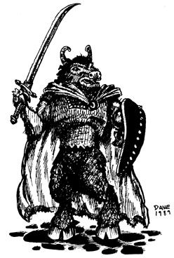 Kenders relate moderately well with other humanoid species, and will associate and travel freely with anyone like-minded. NPC's (and perhaps PC's) are playable as normal, with these modifications to their stats: Strength and Constitution +1, Dexterity -1, Charisma -2. Goat Men are never Thieves or Assassins, however. They can raise level in their class as any other character, but have the following ceilings: Fighters stop advancing at level 15; Clerics and Druids remain at 10th level; Magic Users and Illusionists stop at 11th. The Kender is the nemesis of the Orc, and will never associate or travel with Half-Orc characters. In combat, any Kender can give two hooved punches per round if unarmed, with normal strength bonuses applicable if desired by the DM. In addition, the Goat Man possesses the ability of INFRAVISION (60'), and has a dwarf-like sense of direction. |