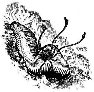 They feed on flesh, tenderizing it first with its burning, tentacle-like probosci (1-4 damage) and HOLDING FAST with any hit of 17 or higher, for automatic additional damage for 1-3 rounds thereafter unless killed. And watch out, they spit! Once every three rounds a Fire Leech can spout a 1-dice non-magical FIREBALL (3' range). |