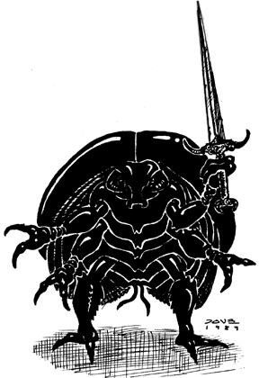 may be unleashed upon the Prime Material plane, but these are rare occurrences. These powerful foes can bite for 1-8 damage (30% chance of poisonous infection per bite), and in the same round can attack using any sharp weapon, adding 5 to all damge inflicted due to sheer strength. Anyone foolish enough to attack from behind most roll to hit a -6 AC due to the thickness of these blackened beings' shells. This class of Insect-man is among the more versatile in any environ, and can pursue its enemy through land, air, and sea. They are among the more hated breed of Macronid and are rarely seen with other types. It is rumored that they are to be banished forever from the Macronid Abyssal layer, and as armies are being formed, a quite literal underground movement of dictatorship within Beetle clans is beginning to take shape elsewhere. It is even rumored that a particularly gigantic Super Beetle (Ed: sorry, couldn't resist.) is making plans against the Debilitator himself. |