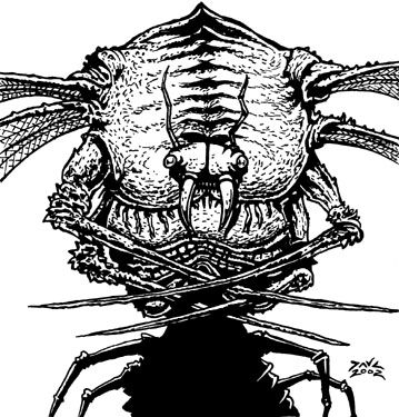 true name is unpronounceable by man and is referred to as "The Debilitator" in all lore about the nefarious Insect-men. The pseudonym probably refers to a strength-draining affectation to those unfortunate enough to suffer the god's physical wrath. His sickle-like appendages (5-30) carry severing effects combining those of a VORPAL SWORD and SWORD OF SHARPNESS. In addition, those hit suffer 1 lost point of Strength and 2 of Constitution, only regaining them after a day's rest per point. If either stat reaches zero during combat, the character will become comatose, not waking until the following day when the first points are regained. Inside the hive of the Debilitator lairs hundreds of Macronid servants, and he is able to summon 6-60 of them within one round, and 100-10,000 swarming insects as well. This summoning takes 3-5 rounds elsewhere in the Abyss. |