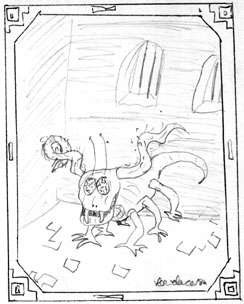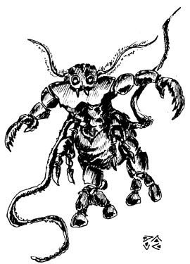whip-like appendages make it distinctly alien. Its physical attacks come at a blistering pace, redering terrible amounts of damage. First come two sickle-shaped pincers (2-8 each) which can sever as a SWORD OF SHARPNESS. Next come the two lashing tentacles (4-16), and any strike can hit targets surrounding the beast at all sides. The Lice are among the more religious of the Insect-men races, offering human and lesser Macronid sacrifices to the Debilitator on regular bases. More than half the entire population of Lice lair within his mighty hive and serve as his favorite warriors. |