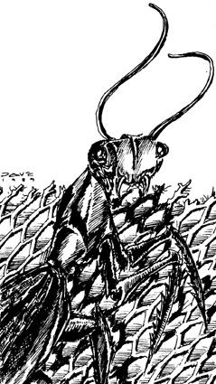 serve by governing of the lower classes while providing the last line of defense for the sacred hive. These devilish Insectoids have two lethal appendages similar to those of their god, which render 4-24 damage per hit and carry the effects of a VORPAL SWORD. Lopped heads are devoured, with the waste skulls preserved as trophies for their god. The Mantis will also bite in the same round for 1-8 damage, which has a 25% chance of infecting with toxic venom (save normally or die instantly) per hit. This higher class of Insect-man possesses intelligence enough to cast spells either as a 7th level Druid or 11th level Magic-user. This intellect also gives them just enough psionic strength to have ESP (as the discipline). These guards are selfless in every way, attacking at +1 "to hit" when their numbers dwindle, and will never fail to die for their hive. |