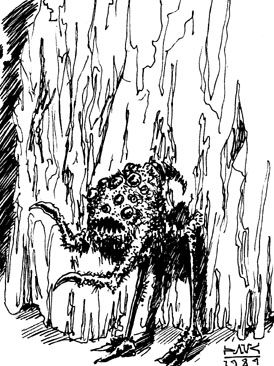 the sun, but also regularly feed on flesh. Herds of Makkorgs will charge full speed, outrunning just about anything else with their long, striding legs. Anyone caught in a stampede of more than 6 must not only fight off head butts (1-2 + STUN) and talons (1-3 each), but an additional 1-4 points per round of trampling damage. Makkorgs can see details up to a mile away and can never be surprised while out in the open, due to a crown of eyes surrounding the bulk of their lumpy body/head. They also have an almost alien architecture to their minds, and have thus far eluded all psionic sholars' attempts at affectation. |