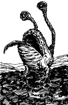 off "empty-mouthed" thereafter. It will never attack its would-be target, however, unless attacked first. It is capable of biting its way out of a scuffle (2-5) and will try to flee to any hiding holes it has rooted out in the area. Mooches are sometimes sought-after by cunning traders because of their low intelligence. Many a Mooch has fallen prey to the old yarn about trading these shiny, beautiful copper pieces for that old bag of tatty human jewelry. They are also terrific stores of information about the immediate geography, provided one has something to trade, and also an infinite patience with stuttering, incomprehensible oafs. |
