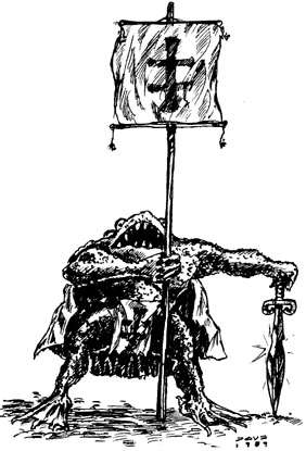 the strongest men, being equal to a humanoid with an 18/00 Strength in every respect except damage adjustments. Frog-men are adaptable beings and can even come in different sizes and classes, but the great majority are of the described average here. However, some of the more feared guardians in Lukather's vault possess limited spell use, while others are gigantic butchers towering eight feet overhead. It is unknown by most if these unusually powerful variants are ever encountered elsewhere... |