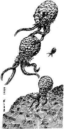 numbers for protection, and to better their search for a fleshy meal. Their ugly tentacled mouths secrete an irritating and potentially hazardous acidic saliva, causing 1 point of initial damage upon a successful bite (which HOLDS FAST afterwards), and an additional point per round until forceably removed. The wound will itch terribly; consider it the "habanero" of all insect-like itches! Scratching is nearly irresistable (save at -4 vs. poison, or simply be tied down, to refrain from it), and causes 1-2 additional points per day until it goes away in a week or so. Punier sorts have indeed helplessly scratched themselves to a bloody end. Swarming Octopests will never leave an area where people and animals are near, but can be kept at bay with fire. Killing one might create a dealy burst of acid to anyone near it (1-6 damage) which carries the same itchy effect as a bite. |