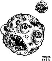 but would have no more ability to surprise than any ordinary sea creature. The creepy little horror will bite with sharp teeth (1-6 damage) at close range, and can also shoot needle-like eggs from one of its orifices (50 foot range) for 1-4 damage, attacking as a 5th level Fighter. Underwater, it cannot effectively shoot eggs. Stirk innards are a quite toxic jelly, and if reduced to -4 hit points or more in one round, the creature will rupture utterly and spew acidic death onto anyone within 15 feet of it for 1-8 damage (save vs. Poison for half damage). And once again, this is an effect which would not happen when submerged in water. There are genetic ties to Beholders and Eyes of the Deep, and Stirks are often found near one of these superior relatives. It is even believed they have psychic connections to one another and can see what others can see. If this is true, they would make excellent all-seeing scouts for a Beholder above-ground, or an Eye of the Deep underwater! |