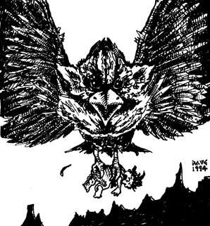 with the added advantage of flight. They swoop onto anyone unfortunate enough to be under their airspace and attack with sharp talons (1-12 damage each), and can pick up and drop any humanoid of no more than 1,000 gp weight (children, elves, dwarves, halflings, very lean humans, etc.). Damage inflicted by the drop depends on the surface below, but is typically 1-6 points per ten feet (save vs. Paralyzation for half damage). Anyone directly underneath trying to catch a falling body has a percentage equal to six times their dexterity, divided by ten for every ten-foot fall distance. So, a Thief with an 18 dexterity, trying to catch someone 100' above them, still only has an 8% chance of success. However, they will always make the sacrifice of bearing half the brunt of the damage if they do fail to catch cleanly. Unless the height is extreme, if the falling body is a child, no damage will be inflicted to the would-be catcher, and the child will only retain 1-4 damage ddue to innate sturdiness. Avian trolls with their "hands full" will be unable to defend themselves and will always let go of their payload when hit. If the Troll is perched, it is equally defenseless, so sneak attacks are always a good idea. This is a tricky thing to do, since its excellent hearing affords them the trait of only being surprised on a roll of 1. |