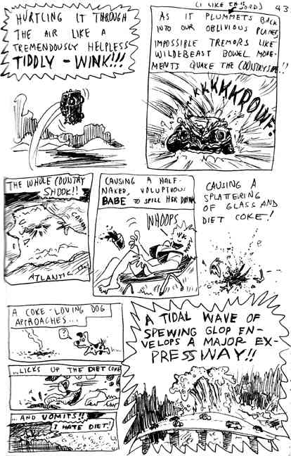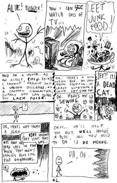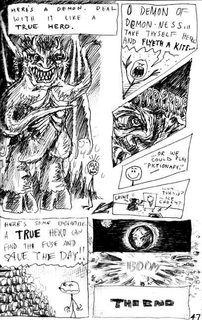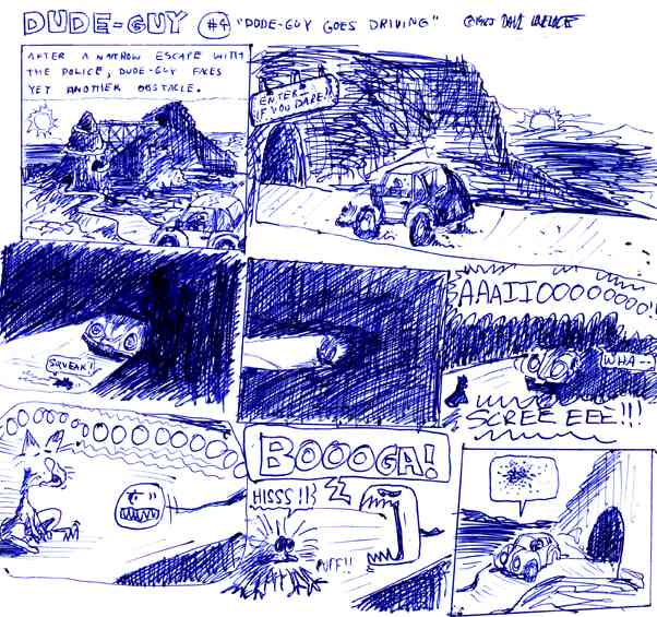 | Dude-Guy was a recurring character in Barfman. I was only 15 years old, and already making spin-off material! Dude Guy was a stick figure thing that I'd make when I was just plain too lazy to even draw something as complicated as Barfman. I remember how much my Dad actually loved Dude-Guy. He always did have unparalleled taste. The history of Dude-Guy is as complicated as it is unnecessary for me to tell it. He showed up in a few of my old high school Barfman adventures as a bad guy (one episode is scanned and included below). Then in 1986, I was gifted a moleskine, and started filling it up with all kinds of weird creations that you'll never, ever see. By 1988 I drew what I considered a pretty amusing creation story for him in that book, and that's included below, too. Then in 1989-1990 he made some cameos in Barfman when it ran in UCONN's Daily Campus newspaper. These "Supplements" sort of acted as intermissions in the Barfman storyline, made as filler for when the editor needed an extra cartoon for bonus editions of the Campus. Three of these Supplements can be seen on the Barfman page. Without further adieu, here he is...DUDE-GUY! |