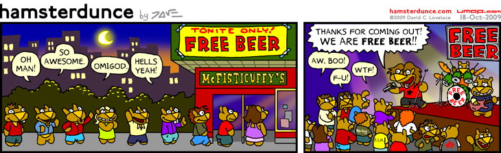 These Sunday ones have been really fun. This one features 26 hamsters. Please enjoy the full color hamsters. And by the way, yes, there are very probably 100 bands out there called "Free Beer." Another good one, I always have thought, is a band called "TBA" (as in "To Be Announced"). For local music news-rags that run band info, bars & clubs will just tell 'em "TBA" if nothing's set in stone yet, so this wuold be a good name for a struggling young band; people might actually believe they're playing like a dozen gigs in one weekend! If you use this idea, you may mail all your excess residuals thusly-like. |