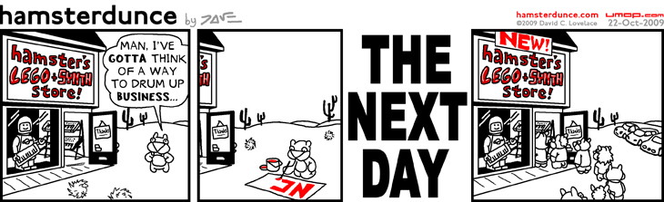 PERMALINK TO THIS COMIC: http://umop.com/hamsterdunce/022.htm So around the corner, there's this place that used to be called "Adam's Food Store." They've recently changed their name to "Discount Food Store," retaining all their crappy employees and crappy prices. Their deli won't even be re-opened for another four weeks. But for some reason, because of the name change alone apparently, the place is three times as packed as it ever was. It took me 20 minutes just to buy seltzer, people. |
