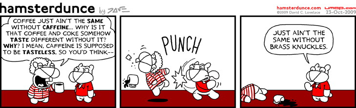 PERMALINK TO THIS COMIC: http://umop.com/hamsterdunce/023.htm Not sure how I feel about the mental structure behind creating this particular comic. I regularly wonder about why caffeine somehow makes Coke & coffee taste different, and for that matter, the odd coincidence that coffee and caffeine are so similarly spelled. I will also regularly ask questions like this to anyone and everyone. But this comic just wrote itself with the punching. It was automatically generated by my brain to have this rambling, inquisitive character punched. My only conclusion is that I annoy the hell out of myself, and like I said, I'm not sure how I feel about that. |
