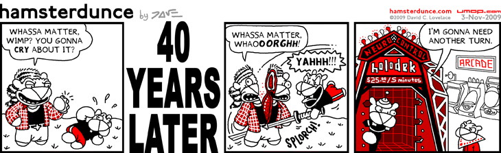 PERMALINK TO THIS COMIC: http://umop.com/hamsterdunce/034.htm The sad thing is, this joke is very probably more than halfway there to being 40 years old already. The idea of holodecks has been around - if my Star Trek nerd memory is correct - since 1987. |