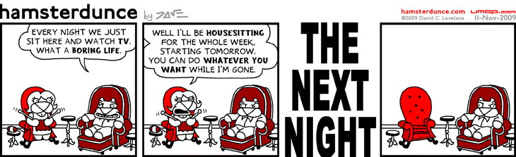 PERMALINK TO THIS COMIC: http://umop.com/hamsterdunce/039.htm Autobiographical, except instead of planting ass in front of the TV, it's planting ass in the office, working on worky work. |
