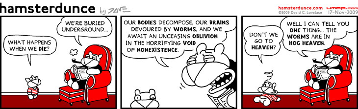 PERMALINK TO THIS COMIC: http://umop.com/hamsterdunce/042.htm Fret not, children. The more you think about an eternity in Heaven, the less scary nothingness becomes. Unless of course Heaven has a holodeck. |