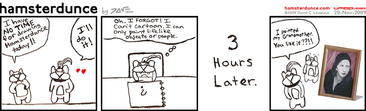 PERMALINK TO THIS COMIC: http://umop.com/hamsterdunce/044.htm My wife had to help me out tonight; I'm pretty swamped! By the way, that thing coming out of her head is a ponytail. That is all. |