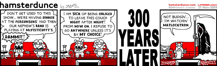 PERMALINK TO THIS COMIC: http://umop.com/hamsterdunce/048.htm For the record, my wife does not knit, nor shall she ever knit. She doesn't nag, either. I think you've got to knit before you really know how to nag. |