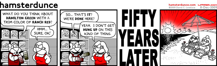 PERMALINK TO THIS COMIC: http://umop.com/hamsterdunce/053.htm So now you know what actual colors we painted our bathroom today... |
