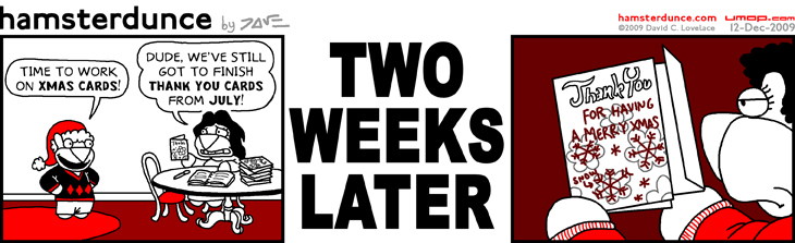 PERMALINK TO THIS COMIC: http://umop.com/hamsterdunce/055.htm There are still a lot of folks from our July wedding that Lee-Ann and I haven't thanked yet (you know who you are). I'm sure by the time our anniversary rolls around, they'll have been wished a Merry Christmas. |