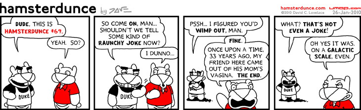 PERMALINK TO THIS COMIC: http://umop.com/hamsterdunce/069.htm 69 isn't all that raunchy. Y'all should try &pi3 * 8(XY-3) for some real interesting fun. |