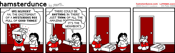 PERMALINK TO THIS COMIC: http://umop.com/hamsterdunce/077.htm My neighbor and I share the same condo entryway, so this happens at least once a week. Oh, bitter disappointment. But why am I surprised, when I can't afford to order anything online anyway. Do I think it's a present or something? I mean, it's February. |