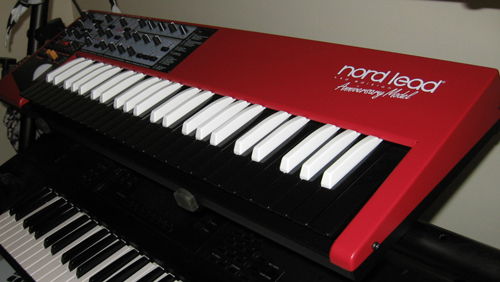 | UPDATE 10/15/2019: Sold in 2018. I was literally using this synth for ONE SOUND, which seems like kind of a waste of an instrument. This sound is heard throughout the Seventh Edge album, and with seven years having passed since that recording project was completed, this gorgeous synth was just sitting around looking pretty, and not much else. UPDATE 5/25/2008: After owning two Nord Lead 2X synths over the years, I've upgraded to the incredibly cool-looking Anniversary Edition. Serial #11 (out of only 299 made) arrived with a nice document of authenticity signed by Mr. Nordelius himself. Other than the black keys and new logo, it is otherwise identical to the 2X model that I have become fairly familiar with. It's great for gigging, being one of the most lightweight boards I own, and with 1,000 sounds there's no shortage of fun with this 20-voice monster. The crazy-ass STONE modulation wheel and wooden pitch bender make for funky interface which takes some getting used to, but once done it's a very natural, organic feel. It offers almost all the features of the Access boards with 95% their quality of sound, at a fraction of the price in most cases. However, with no onboard effects (sound sample is moistened with a Quadraverb) it's ironically more suitable for studio work even though it's light as a feather and thus more desirable for the road. I may trade it one day for something with effects, but for now it's too fun to play with! |