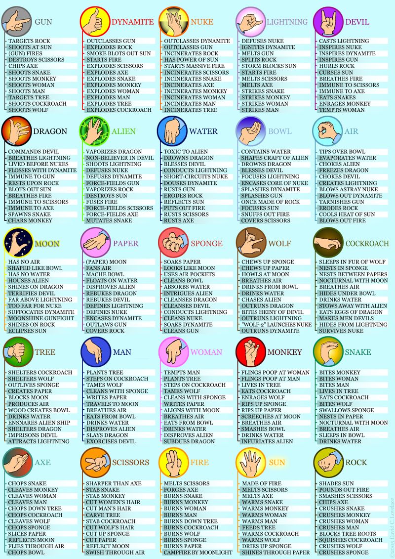 cap this whole nightmarishly ridiculous endeavor with an Earth-swallowing 25-gesture game. This is it...I swear I am done now. You will notice that there is some branching going on with the arrows in the diagram. Trust me, you wouldn't be able to even get close to reading it otherwise. Thick lines branch out to thinner ones, and I've had to actually go around the outside of the circle for the smaller paths. I will be the first to admit that this game is just too complicated and you might get lost unless you really squint. By playing this game you agree not to hold me responsible for blindness, seizures, or let's face it, madness. And now, even worse news: after days and days struggling to come up with a web of valid logic, one which has a potential of over 151.48 QUINTILLION layouts (around three and a half times more complex than a Rubik's cube), and which would include all 300 outcomes (non-tie) in a graphically pleasing cyclical layout, I had to reverse one or two outcomes from previous games. This is a rather hideous offense, but I just didn't have the octillion-sized stamina to help it. For example, with the splitting of HUMAN into MAN AND WOMAN, only WOMAN is beaten ("TEMPTED") by DEVIL now; whereas MAN EXORCISES DEVIL. In other words, DEVIL no longer POSSESSES HUMAN here, unless you'd like to say DEVIL POSSESSES KAREN BLACK (instead of WOMAN), and then it'd work OK. If you find any other discrepancies, let me know. Anyway, many of the ten new symbols are taken from popular sources. Remember the "NUKE-COCKROACH-FOOT" game from "That '70s Show?" Well, it's in here somewhere, where their "foot" symbol is now simply MAN or WOMAN here. A lot of folks remember the "ROCK-PAPER-SCISSORS-SPOCK- LIZARD" pentavirate found here. Well, with the addition of my ALIEN, and swapping "Lizard" for my similar-looking SNAKE, you'll find most of that game in here too. I even added the much-maligned DYNAMITE gesture. So now you can blow up ROCK and SCISSORS all you like, as long as you don't mind being ENCASED by PAPER, and not being able to "cut wick of" SCISSORS as you might have elsewhere. Also, in deference to the extremely hilarious "Monkey Claw" game played here by a certain infamously overthrown tyrant, I stuck in a claw-gestured MONKEY just for fun (and poop flinging)! All of these hijinx don't even include the SUN and the MOON, and AXE and BOWL which were supplied by a fan of the site (thanx John!). Each gesture beats out twelve gestures, and is beaten by the remaining twelve. And with that, there is now only a 4% chance of a tie, making this the ultimate decision-making game! Well, aside from flipping a coin, I guess. UPDATE 6/22/2006: I goofed up last year when determining this chart had 15.5 octillion layouts. After dividing by 25 to get rid of the simply rotated possibilities, and then also by 224 for all the mirror images, and then checking & re-checking, I arrived at a final number equalling a bit over 151 QUINTILLION (that's 151 with 20 zeros) possible ways of putting 25 gestures in a circular layout as shown above. I plan on fixing the poster in my RPS-25 shop to reflect this new number, and hereby offer a refund to any disgruntled customers who already purchased one. And just for the record, armed with accurate math for a change, I calculated over 4 SEPTQUARDRAGINTILLION possible layouts for a 5,050 outcome RPS-101 game! That's a 4 with 144 zeros, and it should be noted that a googol only has 100. Still think I wanna figure that game out, knowing it's 9.58e+125 (quardragintillion) more complex than a Rubik's cube? Or maybe you'd just like to know where I'm finding the actual names of all these big numbers? :o)UPDATE 10/6/2006: I rose to the challenge, broke my promise of being done variating Rock-Paper-Scissors, and decided to totally GO FOR BROKE... |