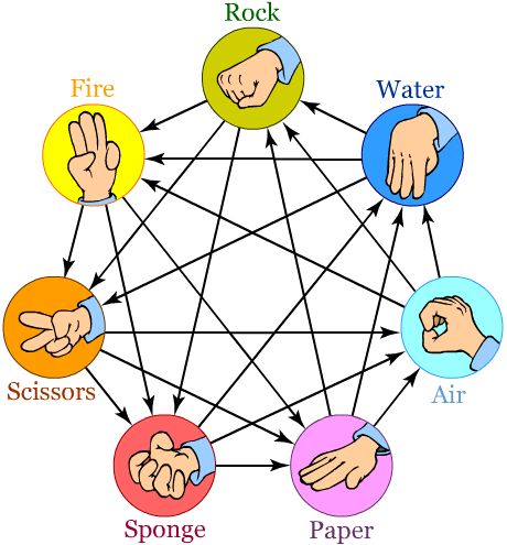 hand gestures (no, none of them is the BIRD). Just today, I happened upon another variant involving "Spock" and "Lizard" through a link on BoingBoing, one of my favorite blog sites. The really weird thing is that just a couple of days ago I was trying to figure out how to improve on the same exact game using Fire and Water gestures, etc., and now lo and behold, just a few days later, I happen upon that link! So now, inspired by this coincidence, I made RPS-7 (Rock, Paper, Scissors, with 7 gestures). Incidentally, there were Here's how you say all the gestures' relationships: ROCK POUNDS OUT FIRE, CRUSHES SCISSORS & SPONGE.FIRE MELTS SCISSORS, BURNS PAPER & SPONGE. SCISSORS SWISH THROUGH AIR, CUT PAPER & SPONGE. SPONGE SOAKS PAPER, USES AIR POCKETS, ABSORBS WATER. PAPER FANS AIR, COVERS ROCK, FLOATS ON WATER. AIR BLOWS OUT FIRE, ERODES ROCK, EVAPORATES WATER. WATER ERODES ROCK, PUTS OUT FIRE, RUSTS SCISSORS. You see? Each thing beats three things, and is beaten by the three remaining. The reason why there can be no six-gesture variant (or any other even number) is that half the gestures would be beaten by three, and could only beat two. There would thus be three undesirable gestures of the six. Since no one would want to use those gestures, you're back to three desirable ones and may as well just play Rock, Paper, Scissors! ...and in case this isn't weird enough, try RPS-9 next... |