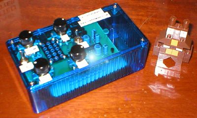 tone, and the placement of your hand (or rather, the shadow of your hand) near the device affected pitch. This single-oscillator thingy sounded amazing once processed (sound sample has some very wet reverb and delay added)...sounds just like a '60s sci-fi movie. Plus it had knobs available for tweaking the pitch manually, and LFO rate and depth adjusters (an LED light blinked in time with the LFO modulation). Finally, the LFO could be switched between triangular (natural sounding vibrato; think of an American siren) or square (now think of a British siren). These effects were all monkeyed with in the sound sample. I got mine directly from "Professor Television" himself on eBay for around thirty bucks, which is the only option to track one of these rarities of a bygone age down, since his site has long since disappeared... |