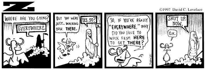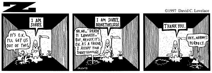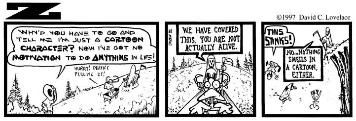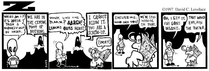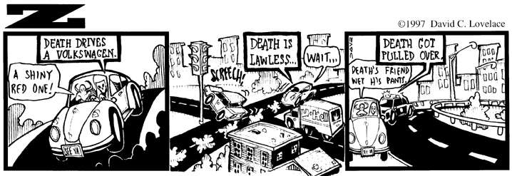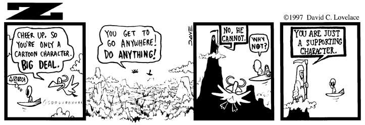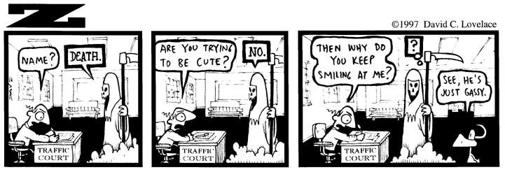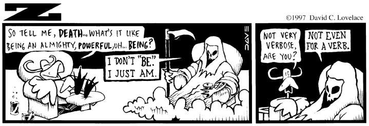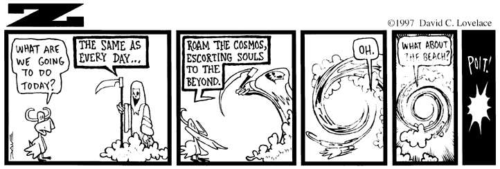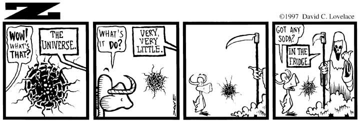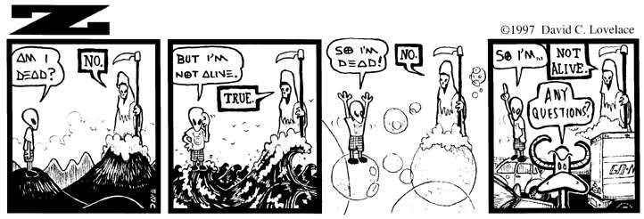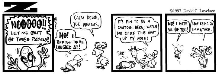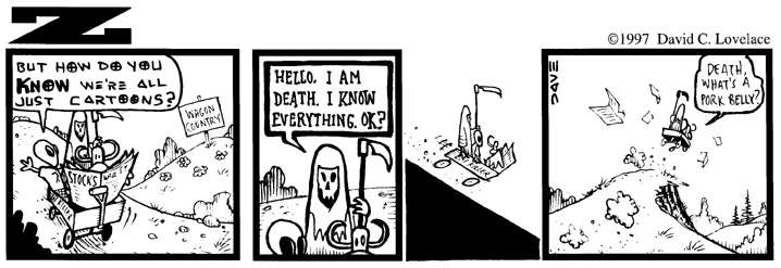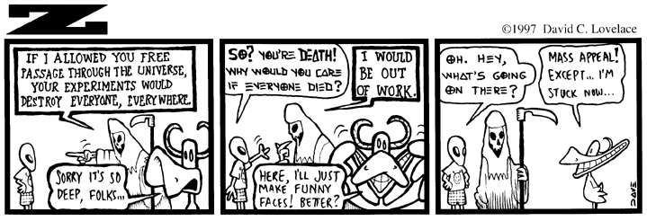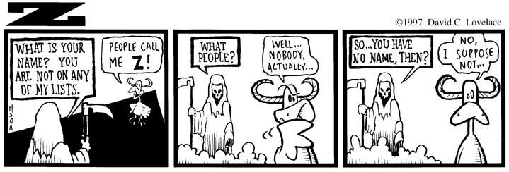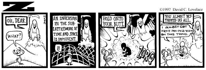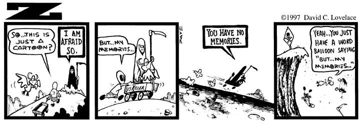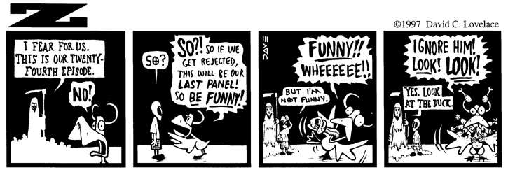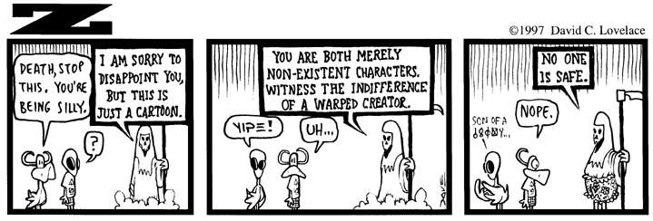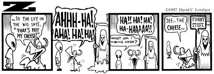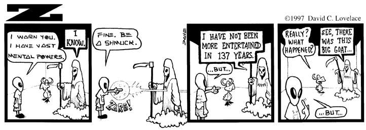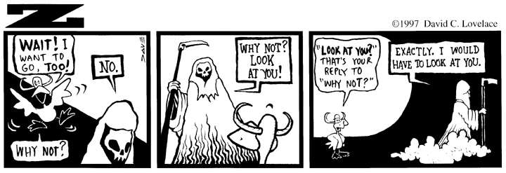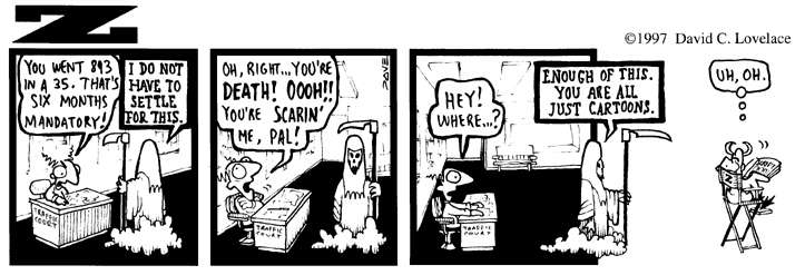 | The Grim Reaper, an alien, and a duck with horns. Destined for greatness? Not exactly! I actually made 24 episodes of this weird strip while out of work a few months in 1997, and submitted them all to the giant, godless syndicates. It took them a record three months to get back to me with rejection, as opposed to the three weeks it took for them to summarily flush Barfman! Speaking of which, the duck character was originally a character in Barfman, but in episodes never printed. They weren't any good, so they're not scanned, either! Bleah! He is also identical in every way except the horns to the duck characters in dux, another failed attempt at syndication. I guess it just wasn't in the cards for this character! |